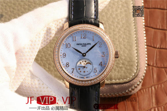 百达翡丽复杂功能系列4968女士手表。海鸥克隆组装215 PS LU手动机械机芯,33.3毫米直径,镶嵌施华洛世奇钻408